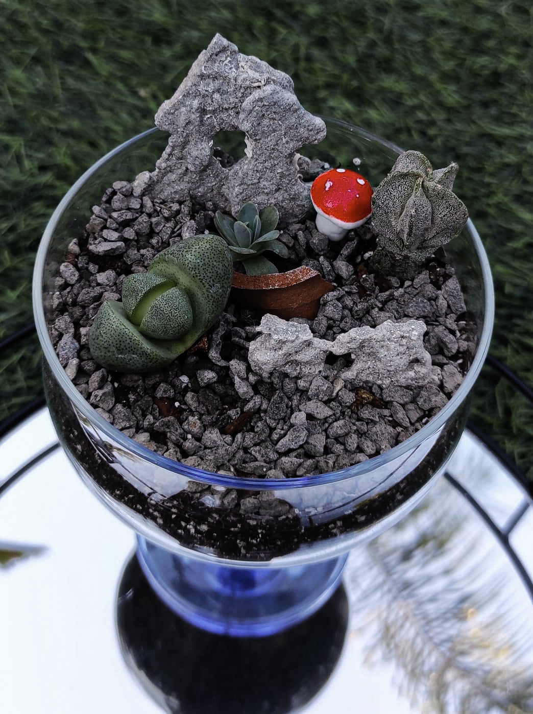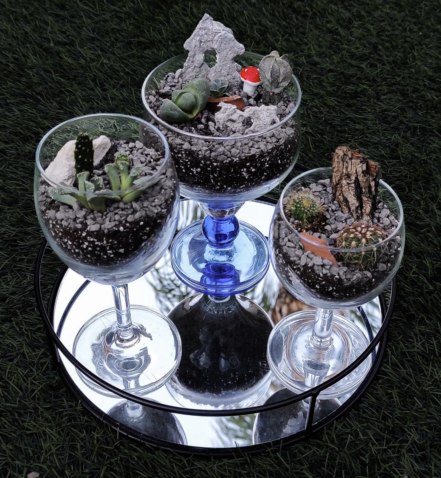 עיצוב קקטוסים בכוסות יין כמארז על מגש מראה הוא רעיון יצירתי ומיוחד